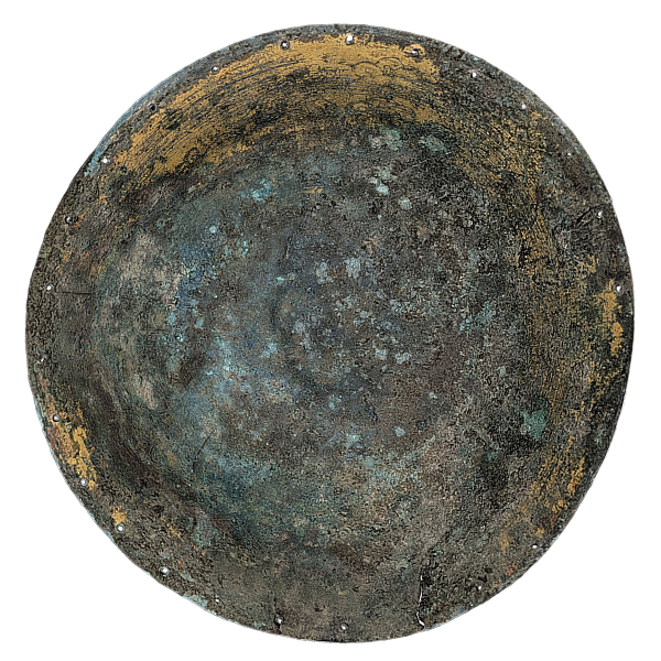 衡端飾通常為一對,綁縛於車衡末端。本件出土於殷墟西北岡遺址1136、1137號車坑。杏葉形薄片,似小盾,上端弧形,下垂至末端聚成一尖,面微曲,背面有一豎向半環形紐,用以缚繩。正面邊緣飾一周環狀邊界,內上段飾角處呈星形的星獸面紋,下段為獸面呈三角形的三角獸面紋,紋飾鑲嵌松綠石。以塊範法製成。